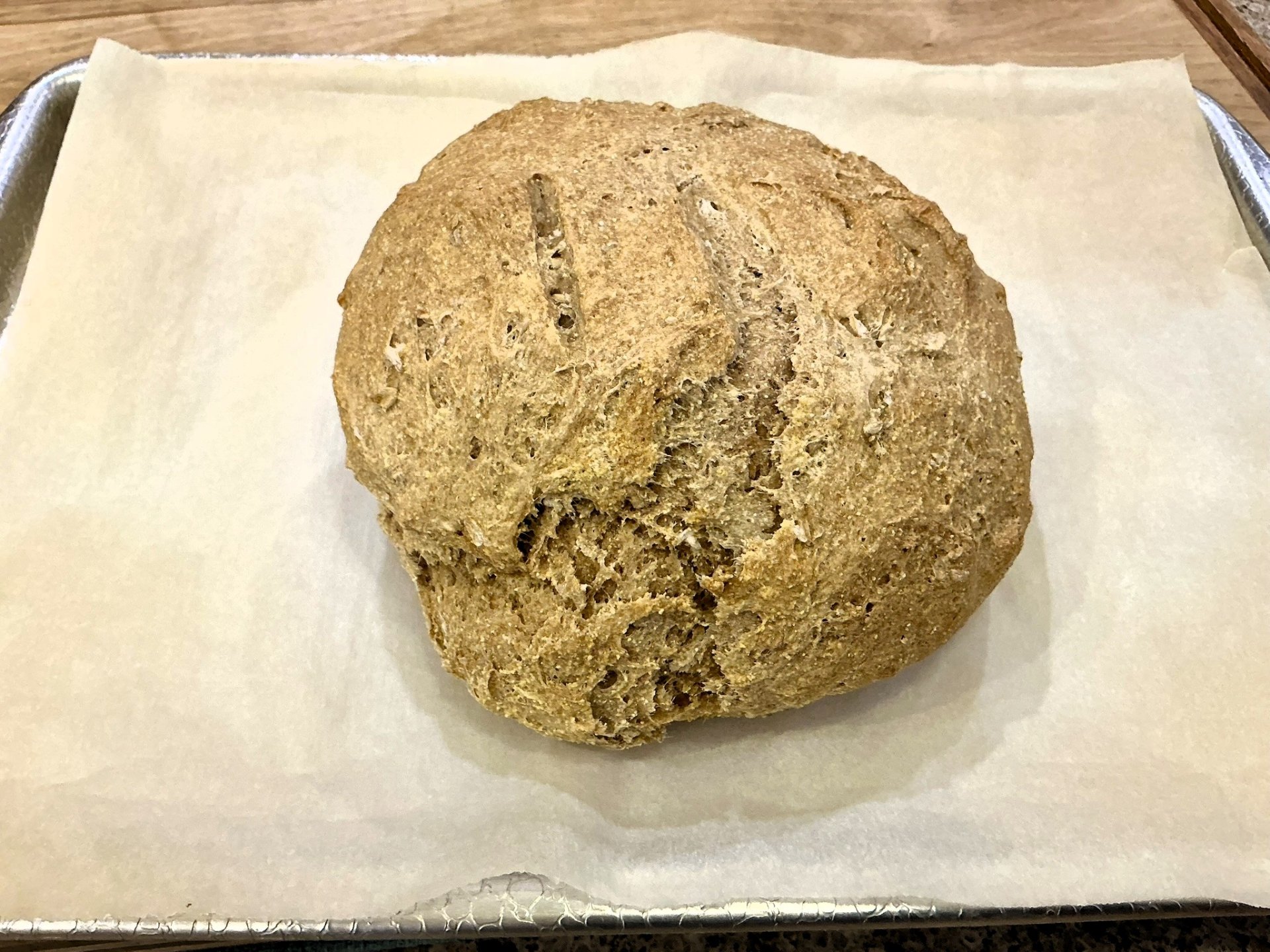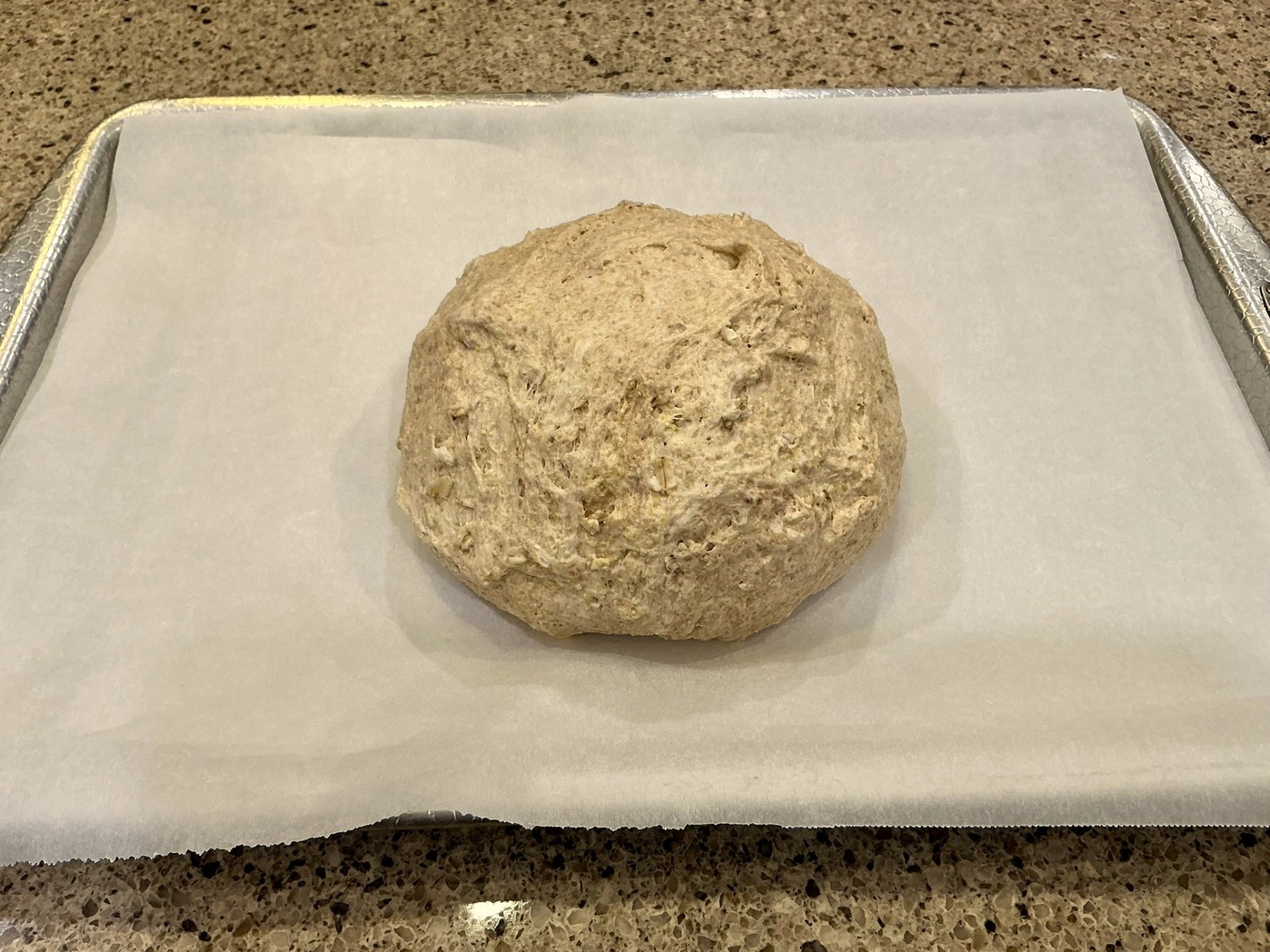 After dough has doubled in volume, remove from bowl and onto a baking sheet lined with parchment paper, shape into a round or loaf(s).