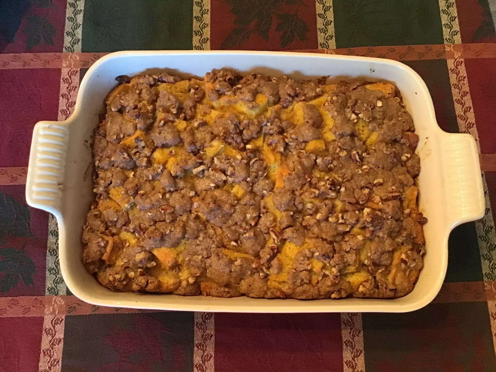 In the morning, take baking dish out of the refrigerator and sprinkle streusel topping all over the top. Let stand about 20 minutes to get to room temperature.