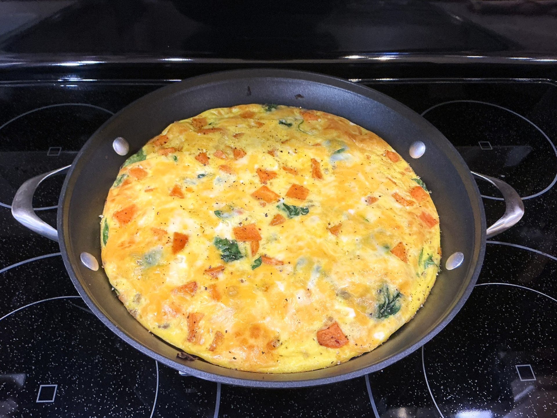 Add roasted sweet potatoes, distribute them evenly across the frittata, and sink some of them.