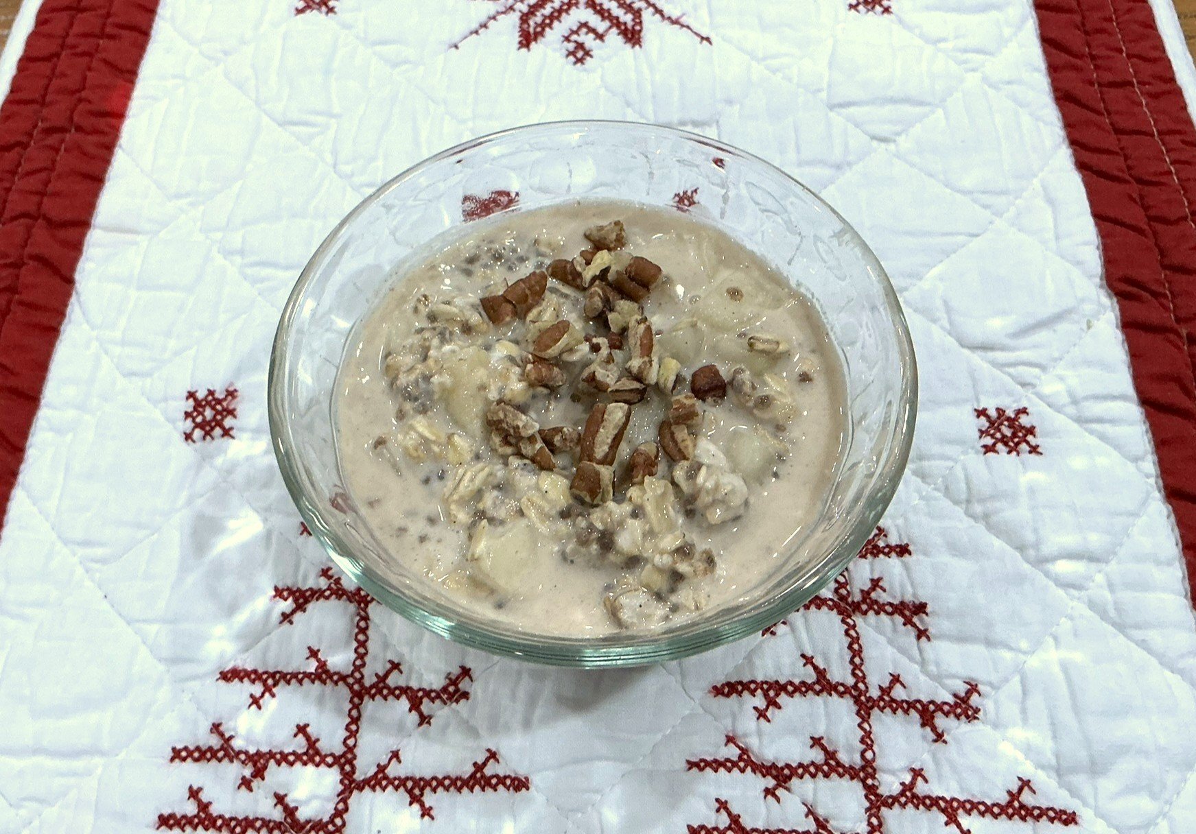 In the morning, stir in yogurt and garnish with chopped pecans if desired.