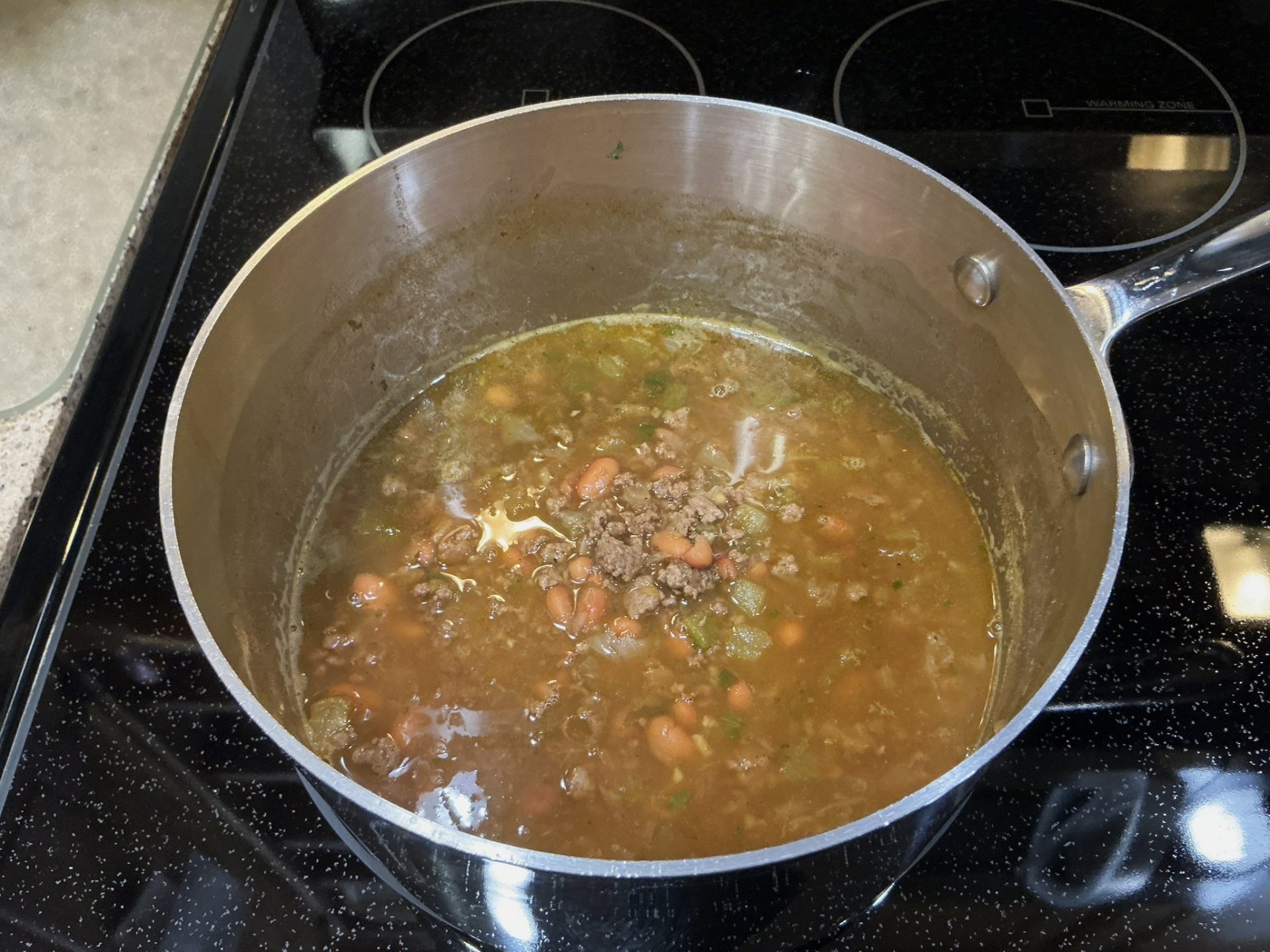 Add the broth, pinto beans and chopped tomato if using; bring the soup to a simmer.