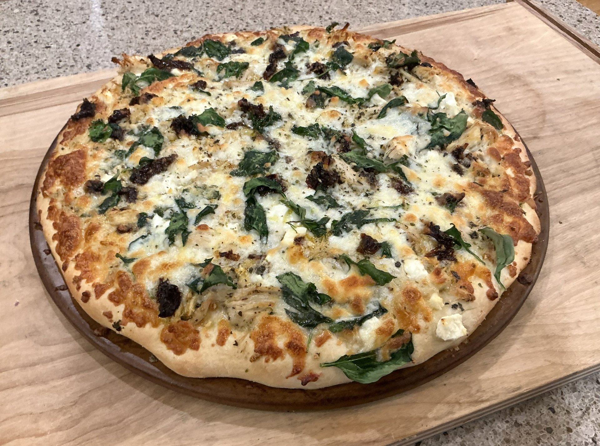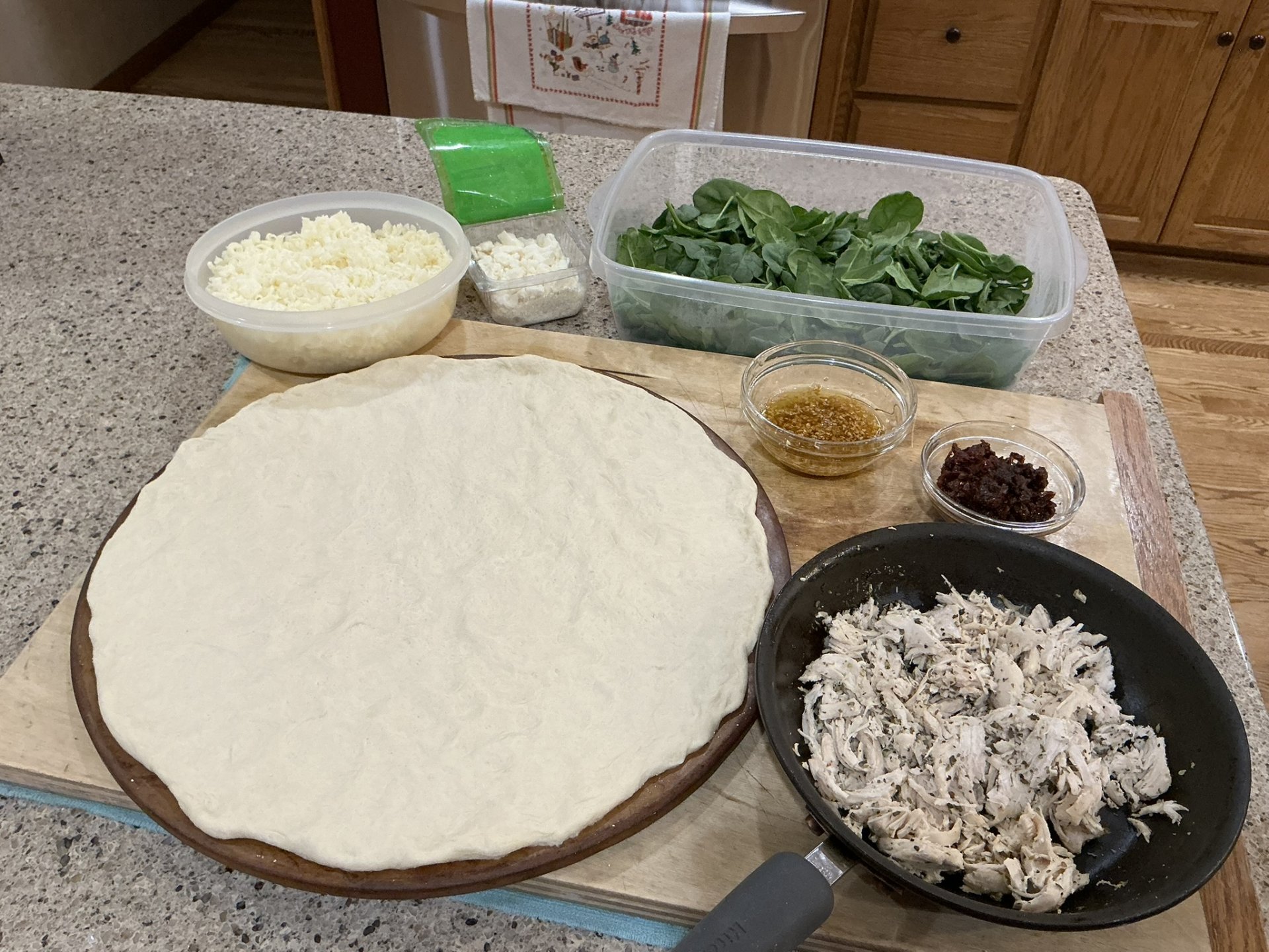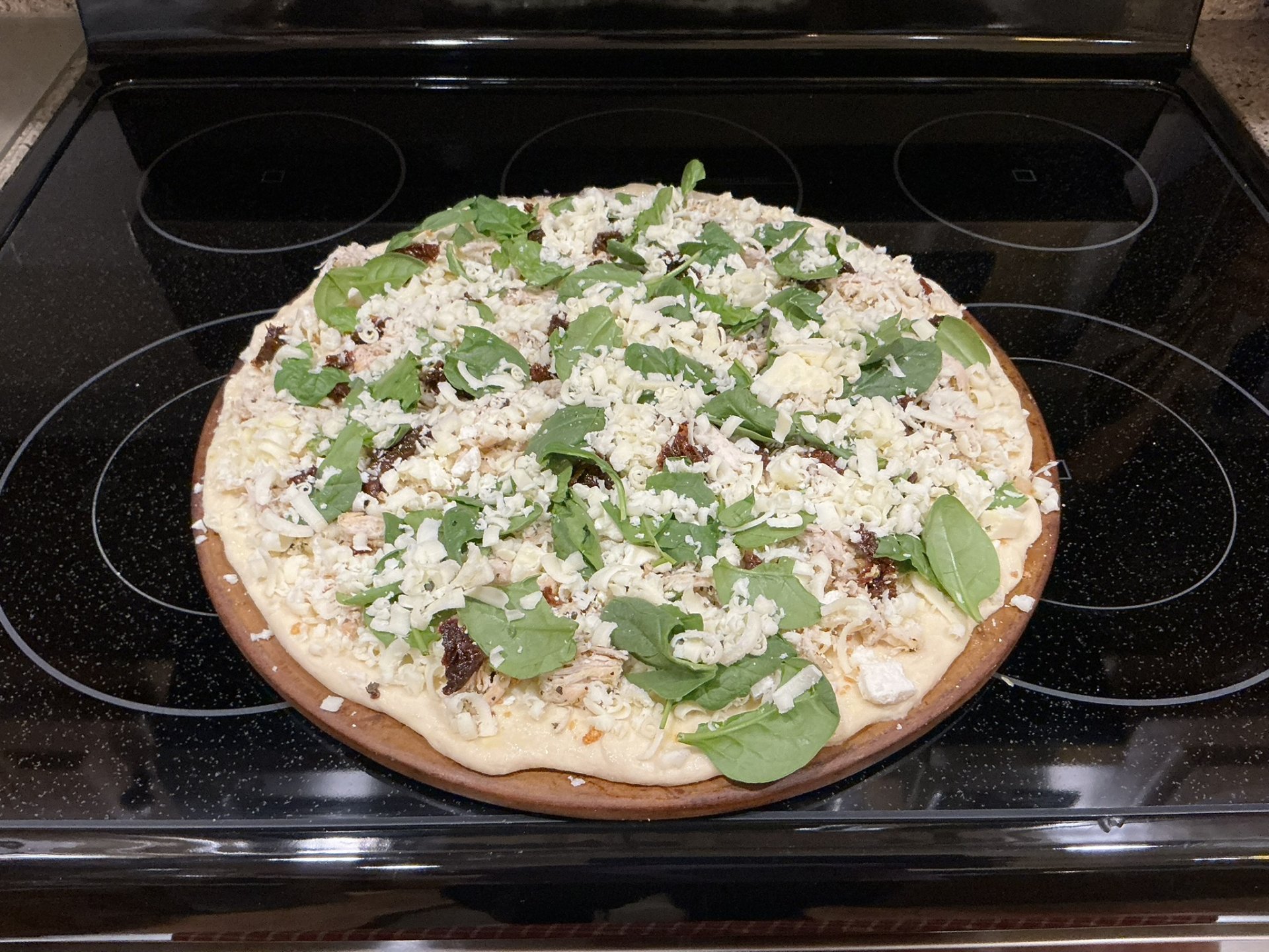 Sprinkle with chicken, feta, sun dried tomatoes, and fresh spinach.