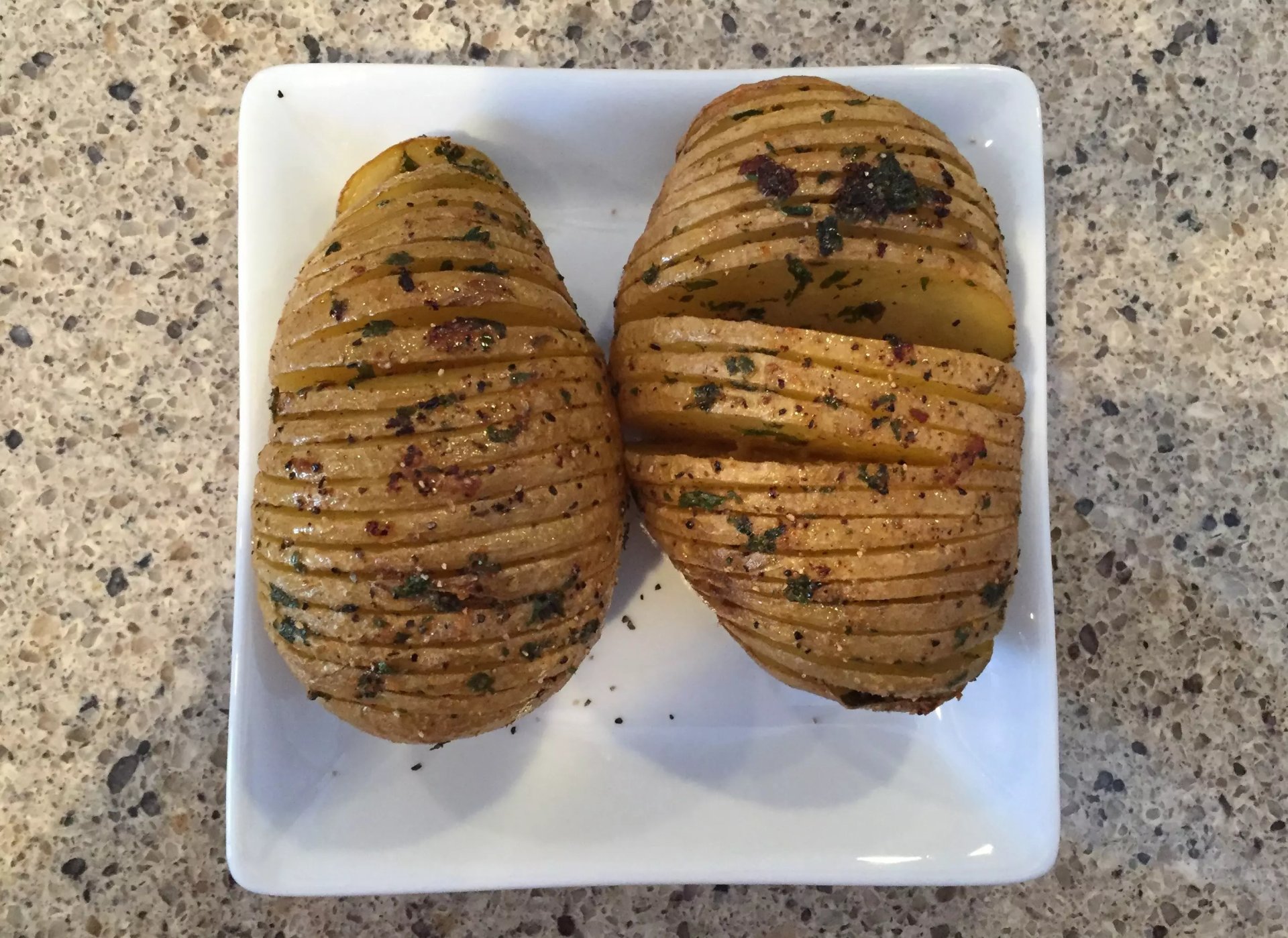With a sharp knife, cut potatoes in half lengthwise. Slice each half into slices, but not all the way through and fan potatoes slightly. Place in a shallow baking dish.