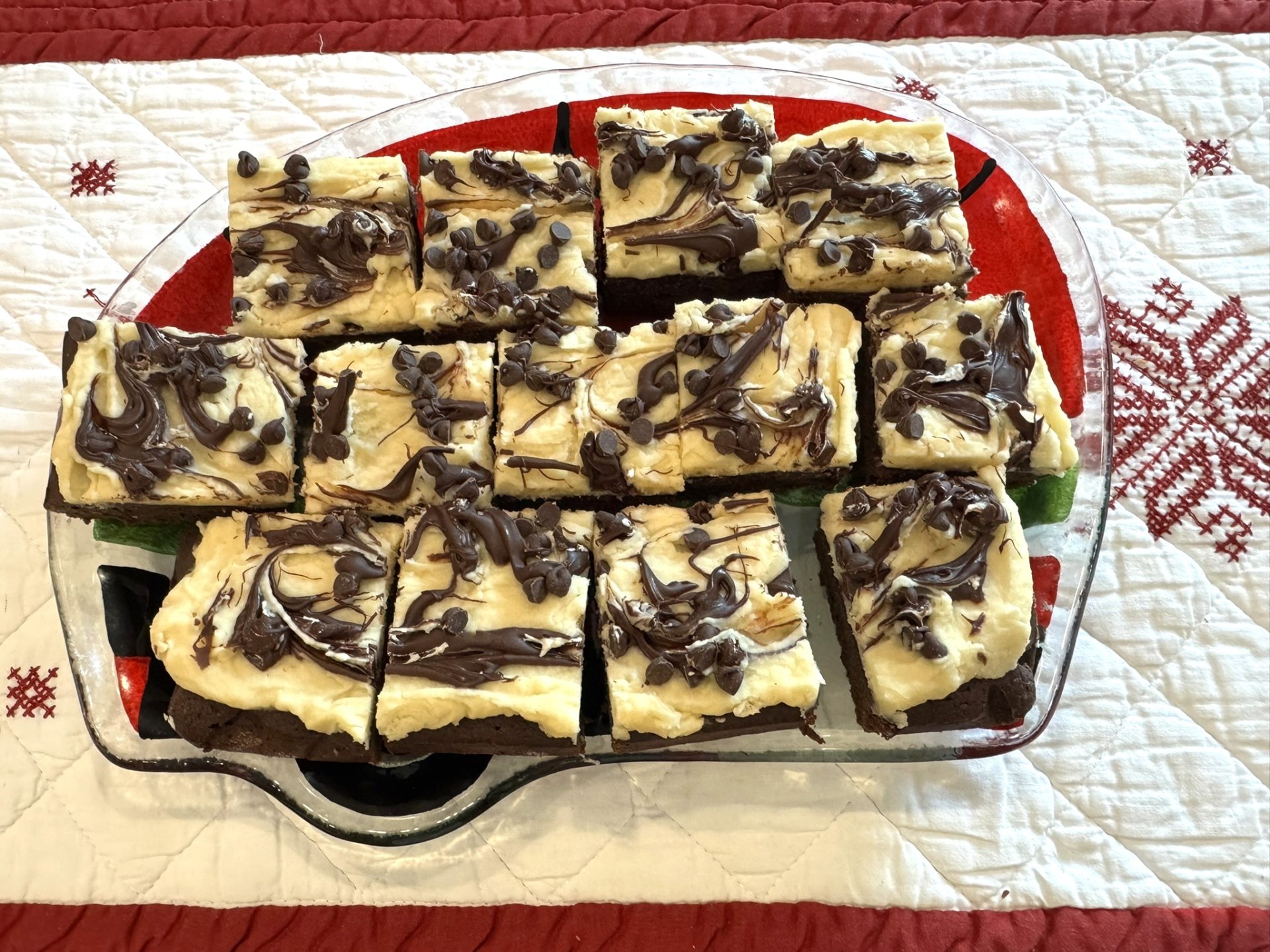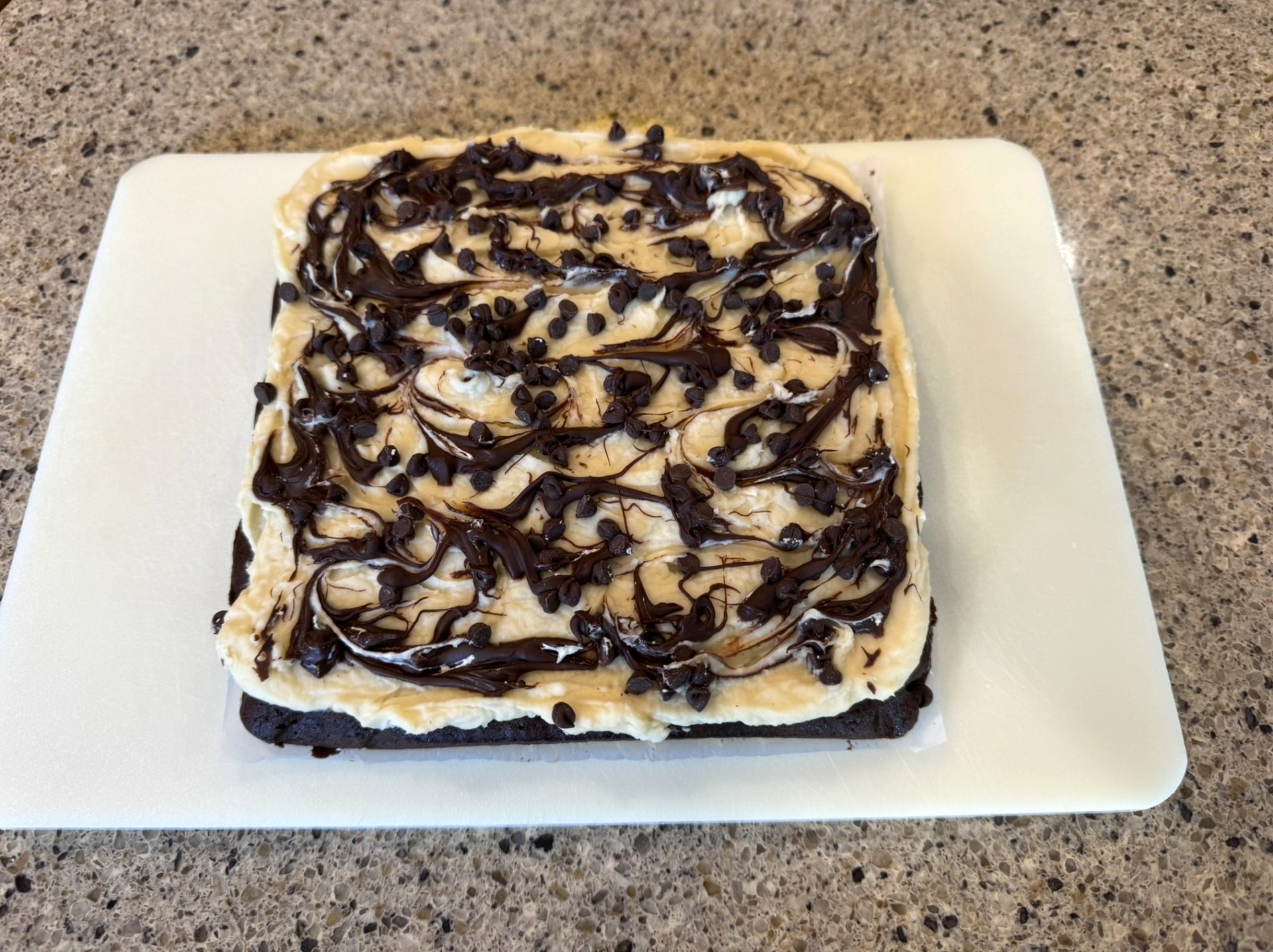 Spread frosting evenly over cooled brownies. Top with mini chocolate chips, if desired. For extra visual appeal, create a decorative drizzle by piping melted chocolate chips in a zig-zag pattern.