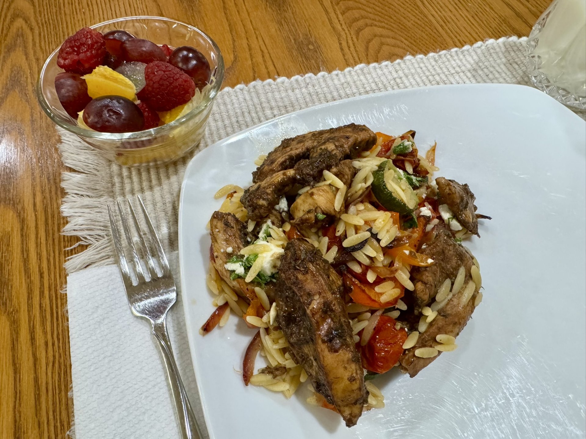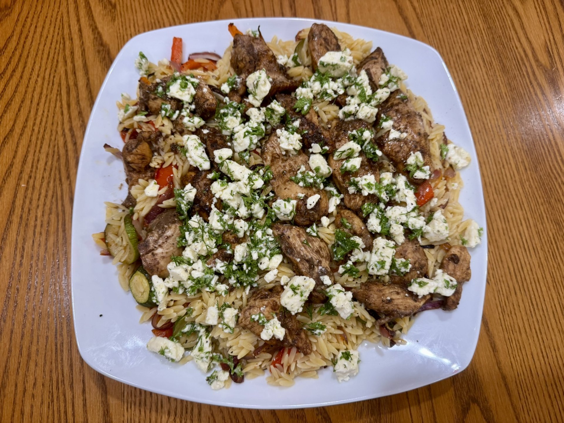 Assemble the Dish: Toss orzo with roasted vegetables. Top with balsamic chicken and finish with generous spoonfuls of herb feta.