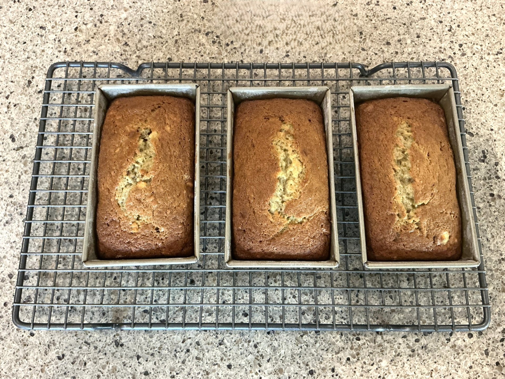 Bake at 350 degrees until a toothpick inserted in center comes out clean, about 50-55 minutes for a large loaf or 35-40 minutes for 3 mini loaves.