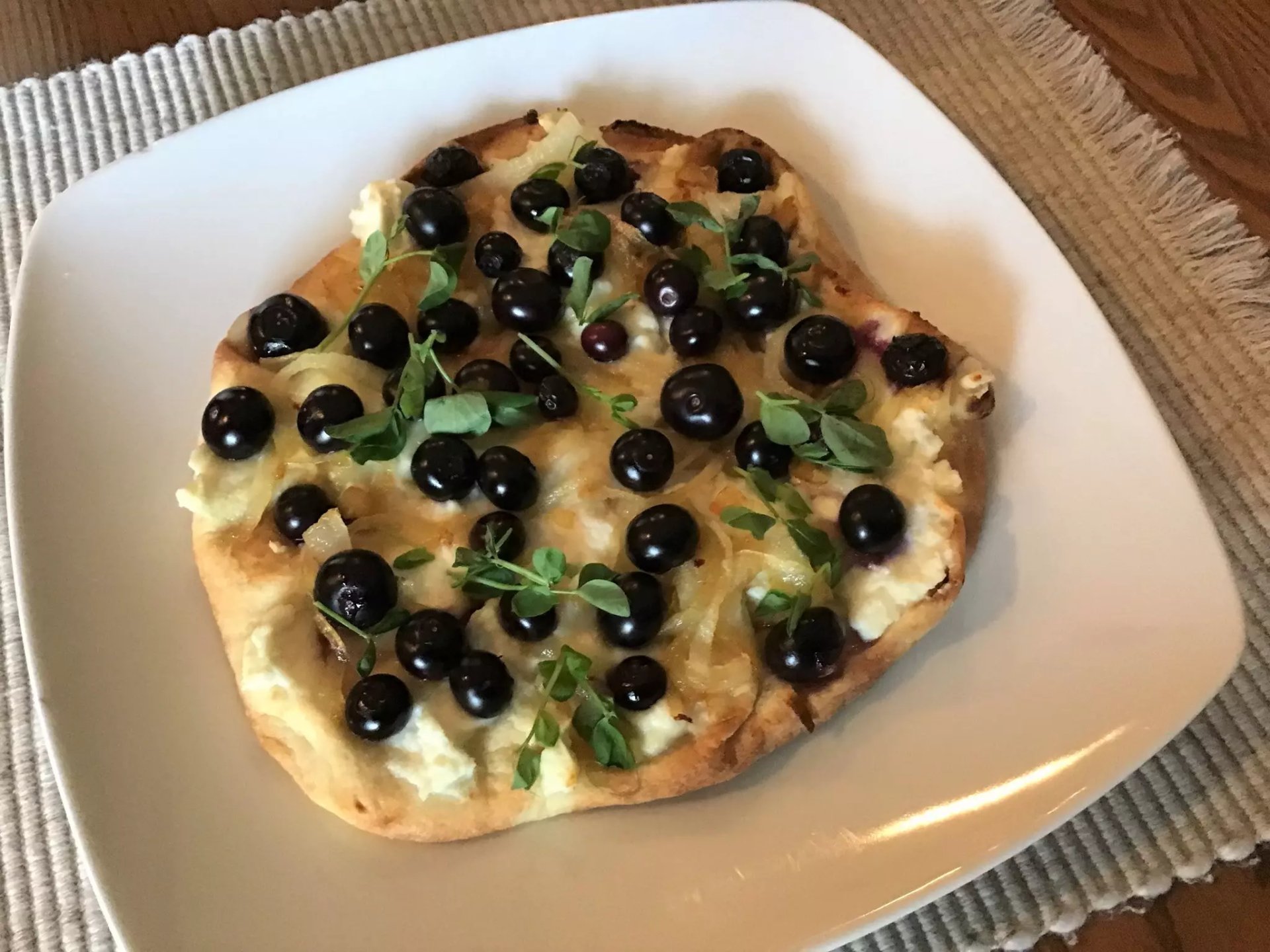 While the onions cook, stir the ricotta and feta cheese in a small bowl. Spread the ricotta mixture over the naan flatbread, and top with the honey caramelized onions. Sprinkle the blueberries on top.