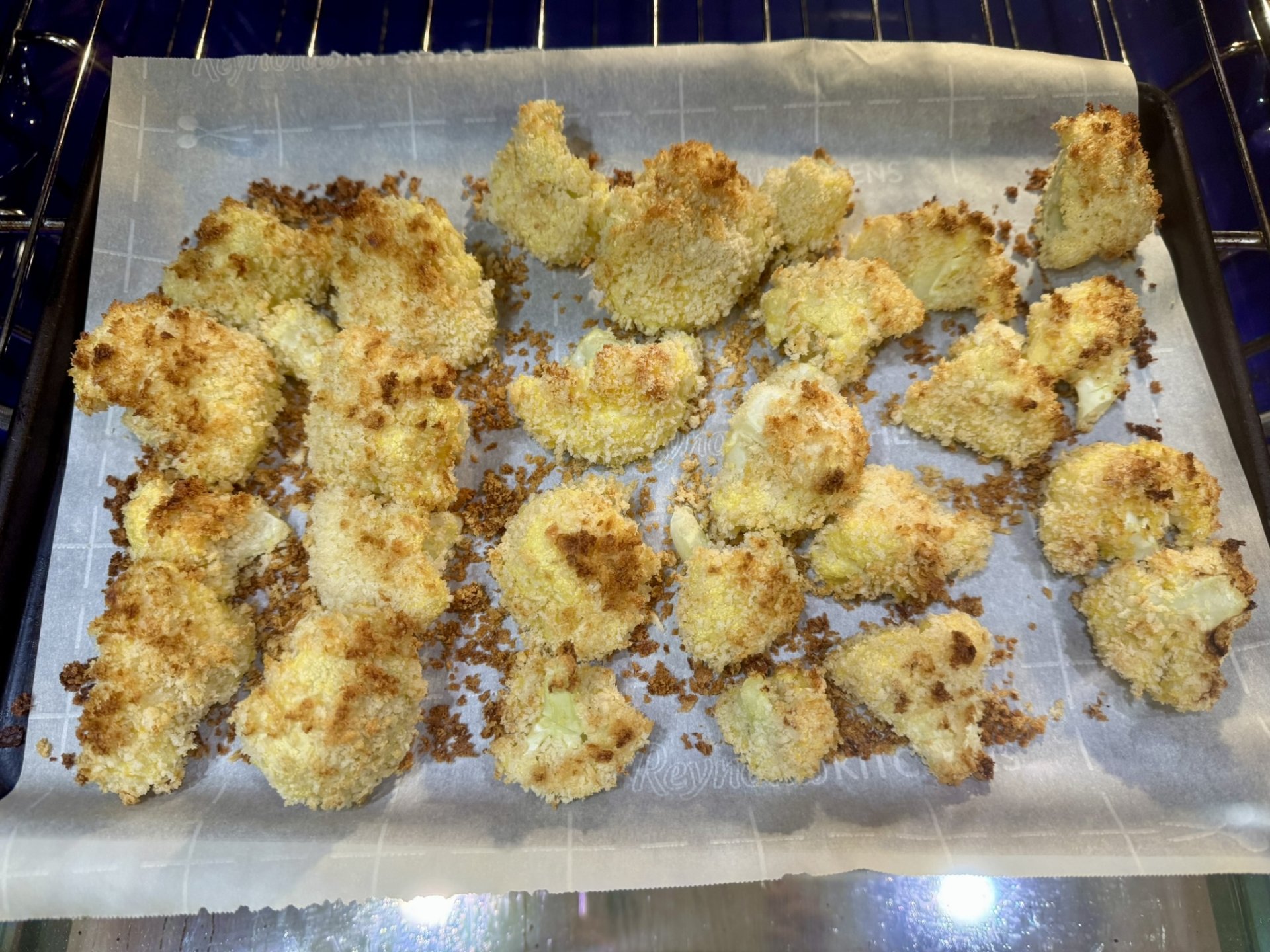 Bake at 400 degrees for about 20 minutes or until coating is dark golden brown and crunchy.