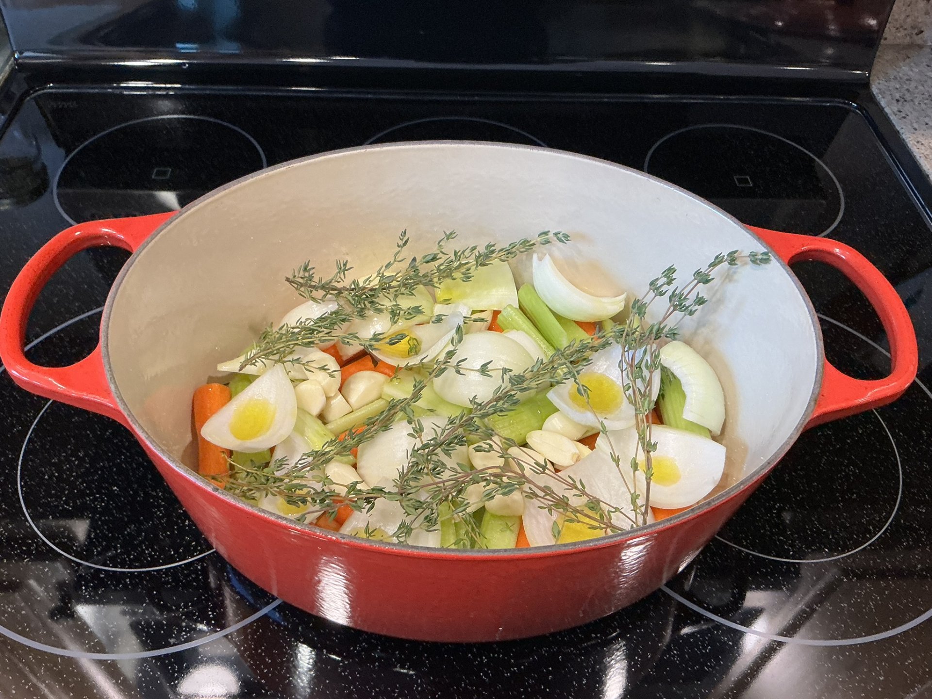 Arrange the vegetables in the bottom of Dutch oven or roasting pan and drizzle with olive oil, season with salt and pepper; toss to coat. Nestle bulb(s) of garlic in with the vegetables along with the thyme sprigs.