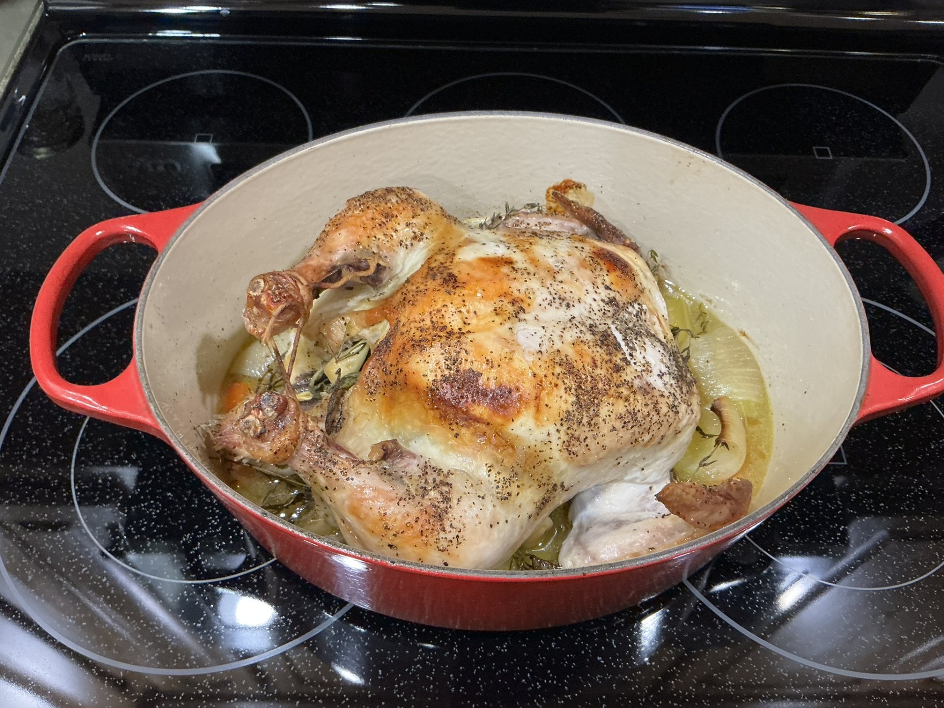 Place seasoned and tied chicken on top of the vegetables breast-side up.