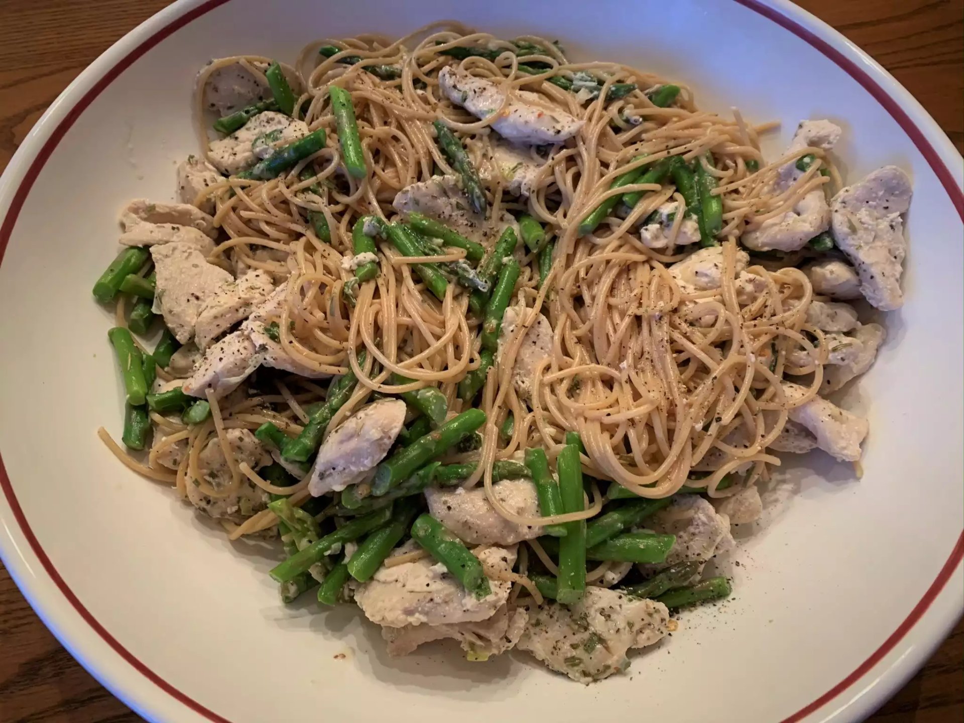 Add the tarragon, asparagus, pasta and chicken. Toss well and serve.