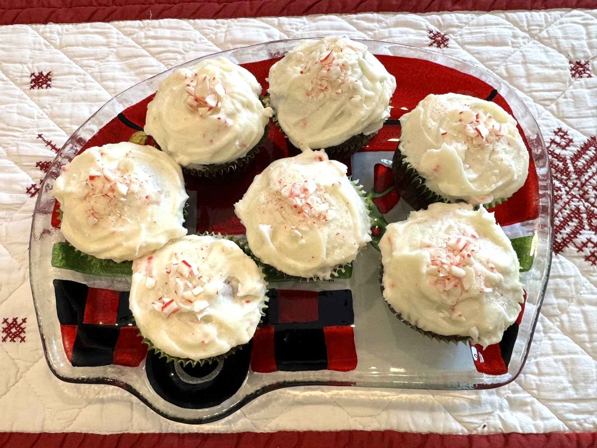 Frost the cooled cupcakes then sprinkle on more crushed peppermints or candy canes.
