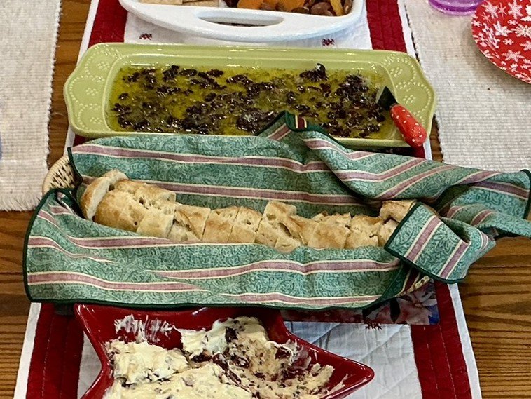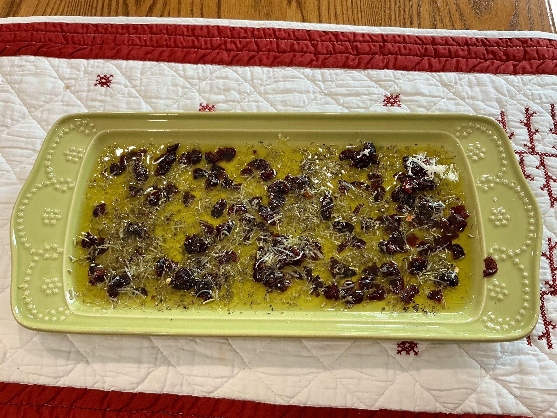 Pour olive oil onto an appropriate size platter or plate. Sprinkle herb mix over olive oil.