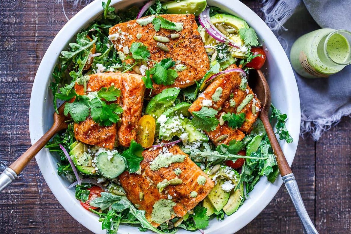 Salmon: Brush each piece of salmon with olive oil, then lightly season each side with salt, chili powder and cumin (or taco seasoning).