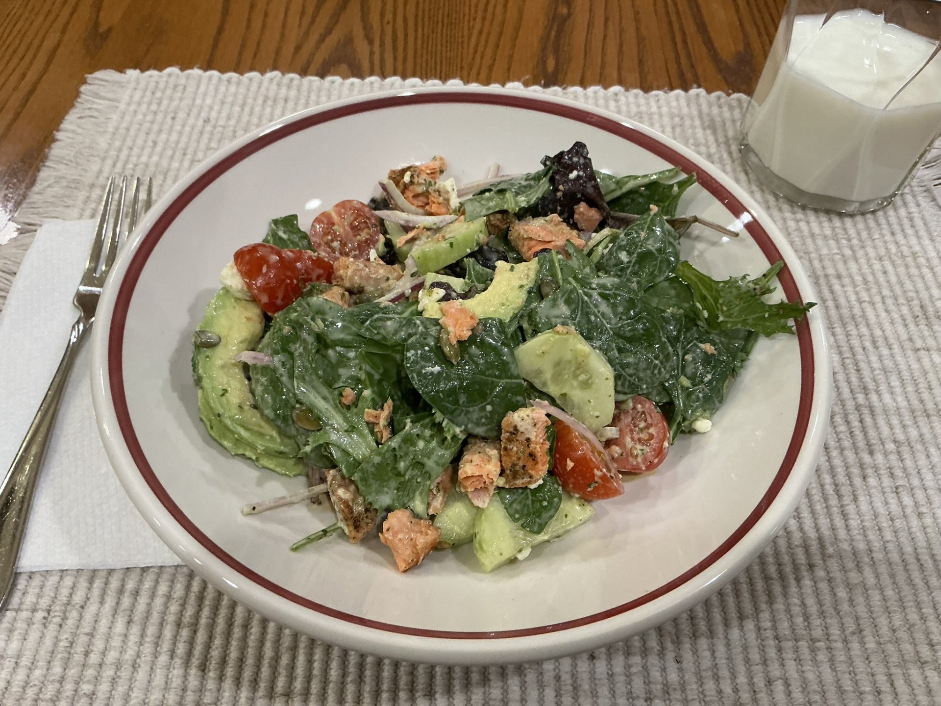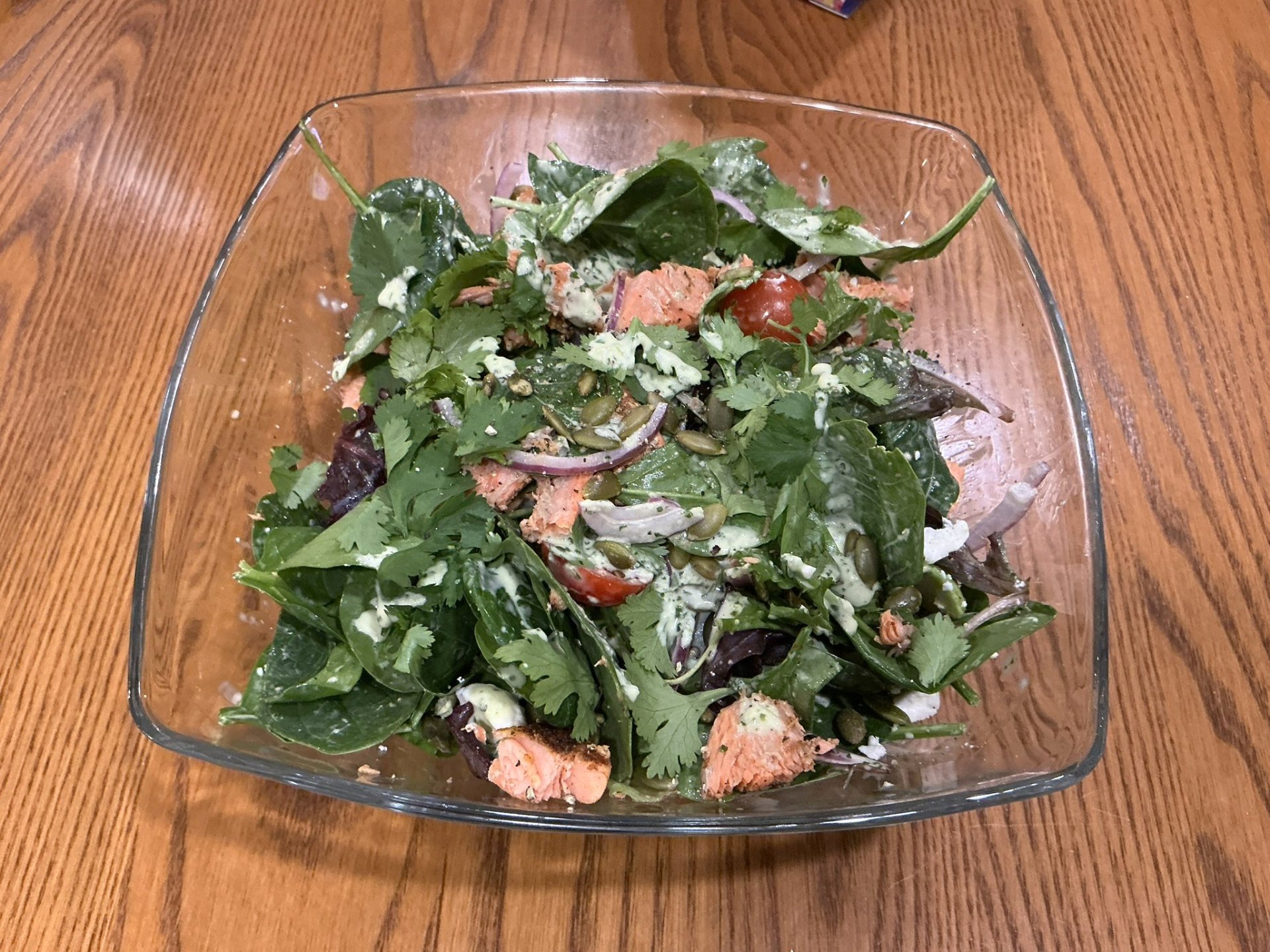 If only making salad for 2, when assembling, use half of the salad ingredients. To serve the next day, heat remaining 2 salmon filets and assemble accordingly with leftover ingredients.