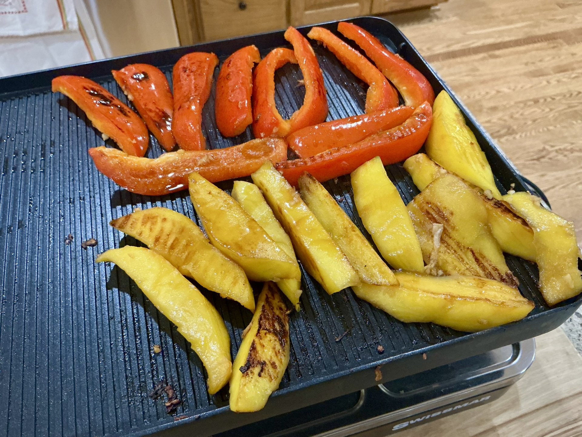 Place the tuna, mango and bell pepper on the prepared pan. Discard the marinade from the tuna bowl.